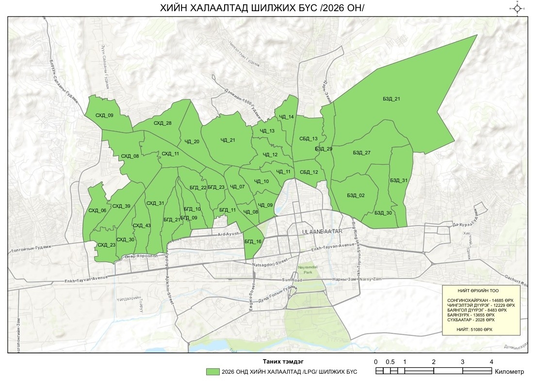 Нийслэлийн агаарын чанарыг сайжруулах зорилтын хүрээнд 2026 онд “Агаарын чанарыг сайжруулах ногоон бүс”-д хамаарах таван дүүргийн 35 хорооны өрхийг шингэрүүлсэн нефтийн хийн халаалтад үе шаттайгаар шилжүүлэхээр ажиллаж байна. Тодруулбал,