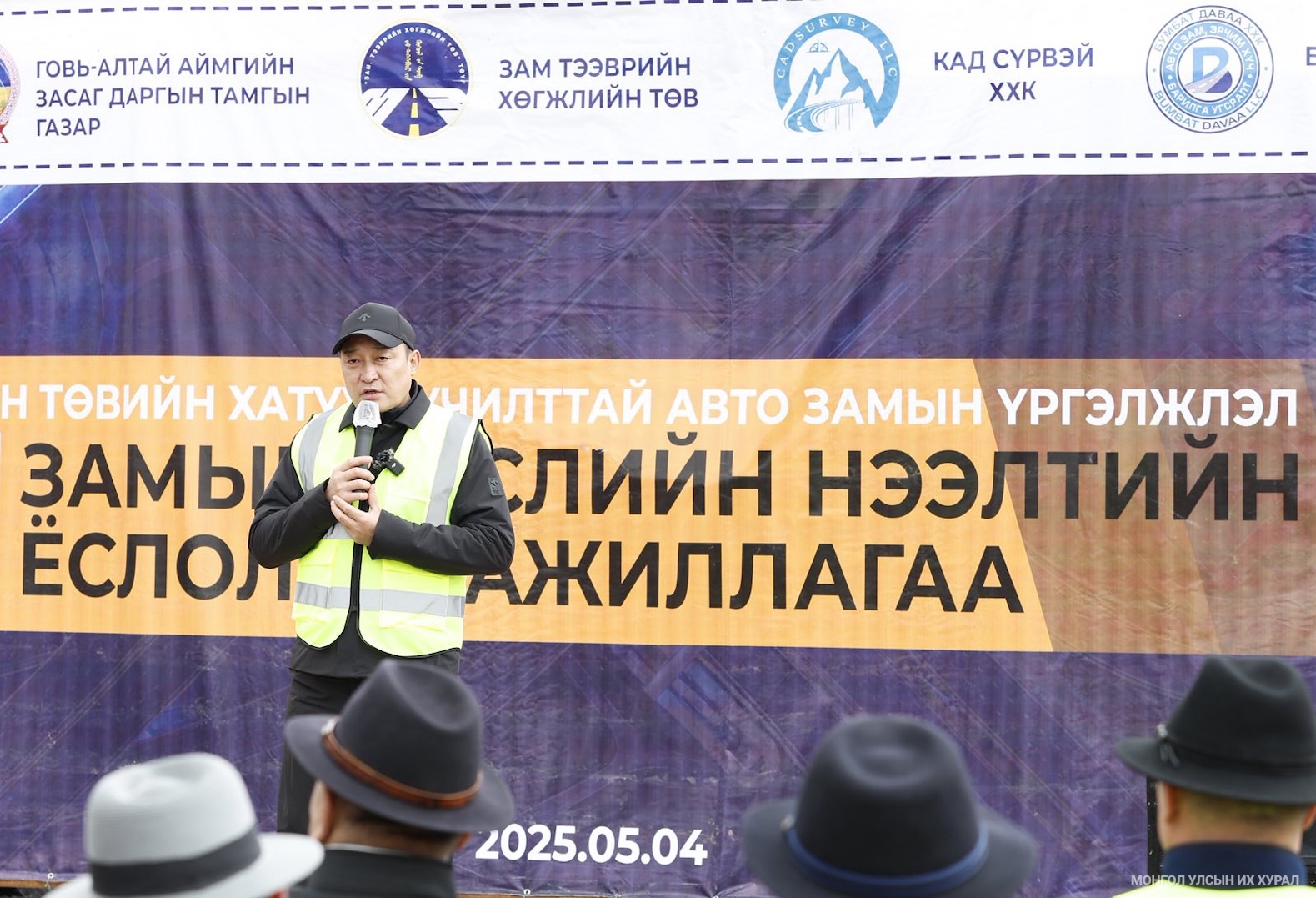 Монгол Улсын Их Хурлын дарга Д.Амарбаясгалан, УИХ-ын гишүүн О.Амгаланбаатар нар өнөөдөр (2025.05.04) Говь-Алтай аймгийн Есөнбулаг, Дэлгэр суманд ажиллаж, тус сумдын авто замын барилгын ажлыг эхлүүллээ.